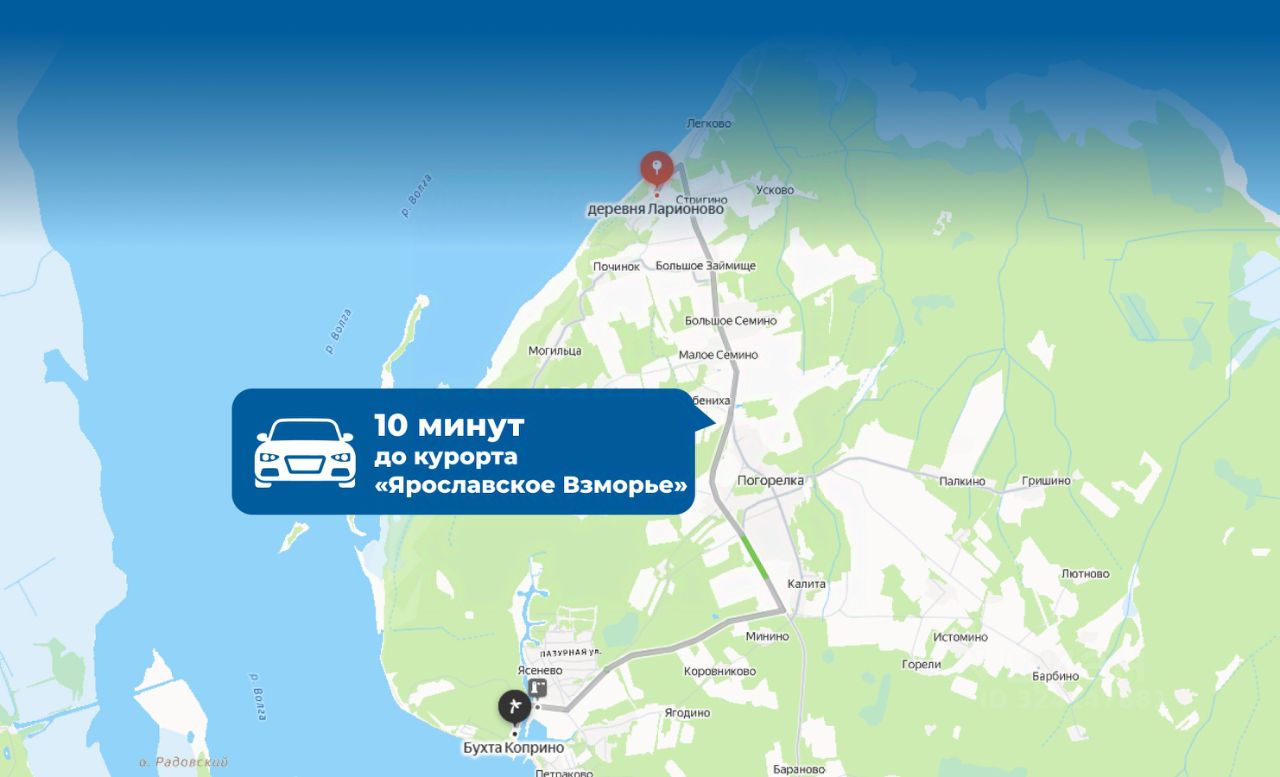 Подъезд к участкам осуществляется по грунтовой дороге, подведены электричество и газ. Участки расположены в тихом уютном месте в 10 минутах от курорта "Ярославское взморье".