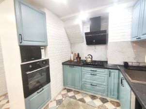 Шикарная кухня 10,3 кв.м. где просчитан каждый см для удобства. большая встроенная посудомойка остается. плита из за закаленного стекла, мощная вытяжка не даст запахам распространиться на дом, большая удобная раковина с гибким краном. Стол можно выдвигать. Барная стойка у окна для приятного кофе пития. Выполнена в спокойных тонах в классическом стиле.