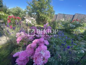 Два участка отделены между собой , на первом расположен декоративный сад : 8 сортов пионов древовидных гибридов и 12 видов пионов премиум класса; кедр, пихта, сортовые ели, туи, можжевельники, липы, сортовые рябины, 12 сортов метельчатых гортензий;