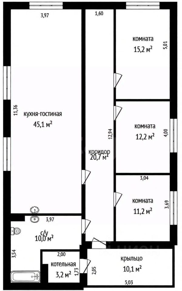 В доме удобная планировка: 3 спальни (15,2, 12,2 и 11,2), кухня-гостиная 45,1кв.м., из которой возможно выделить еще одну комнату, просторный санузел. Есть отдельно построенная беседка.