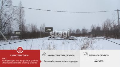 Участок может быть подключен к электросети до 15 кВт. По границе участка проходит газ. Участок 12 соток, земли ИЖС.