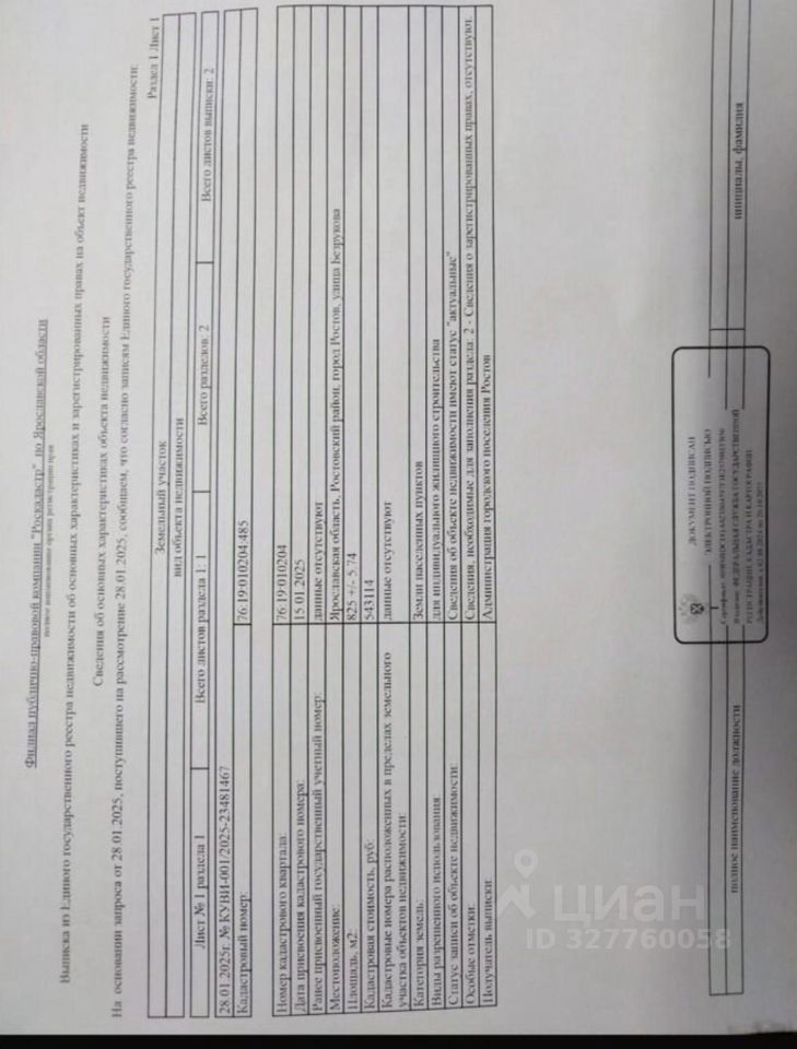 ПРОДАЁТСЯ ЗЕМЕЛЬНЫЙ УЧАСТОК Кaдаcтpовый номeр 76:19:010204:485