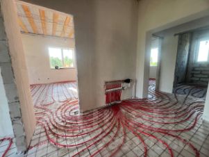 Фундамент - ленточный. Материал стен - газоблоки. Электропроводка смонтирована по всему дому, теплый пол.