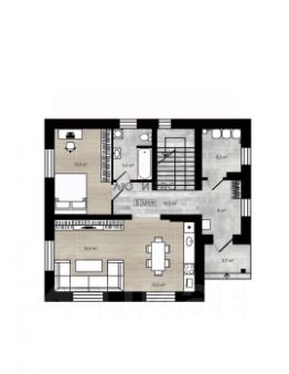 1й этаж: кухнягостиная, спальня, санузел,подсобное помещение, холл.