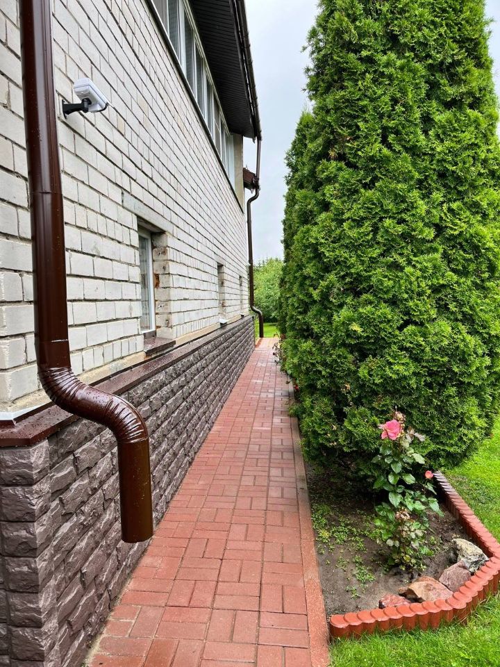 Сделана отмостка вокруг дома, территория перед домом и перед воротами полностью в плитке.