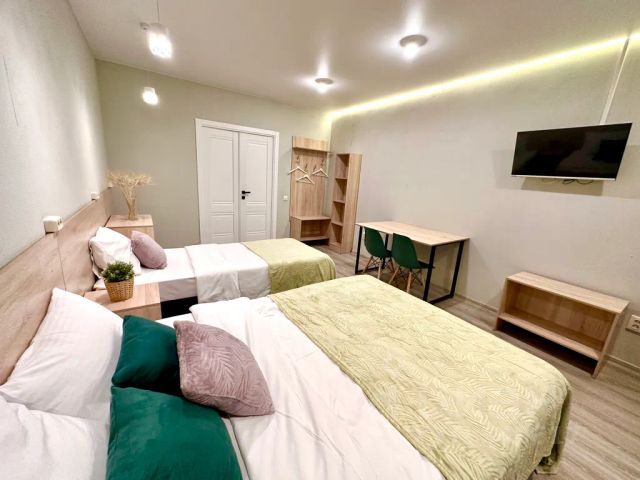Круглосуточное бесконтактное заселение, даже при бронировании ночью (при использовании приложения Apart Sharing для самостоятельного заезда - все инструкции придут автоматически) В квартире есть всё необходимое для Вашего комфортного проживания: Две двуспальные кровати , заправленная чистым бельем из прачечной, раскладная кровать, односпальный диван софа ; WI-FI, кабельное TV; Плита, холодильник, микроволновая печь, чайник, набор посуды; Душ, стиральная машина, полотенца, шампунь, мыло, фен, сушилка, гладильная доска. В стоимость УЖЕ включено: - необходимый набор посуды и техники для приготовления и приема пищи; - постельное белье на основное спальное место (кровать), полотенца на каждого гостя; - качественная уборка жилья перед каждым заселением нового гостя; - предоставление отчетных документов установленного образца. За дополнительную плату предоставляем (уточняйте у менеджера): - дополнительные комплекты постельного белья, махровый халат, ортопедическую подушку; - романтическое украшение апартаментов с закусками; - уборку во время проживания со сменой постельного белья (актуально, если вы заезжаете надолго); - трансфер; - детский стульчик для кормления / манеж для ребенка. Почему гости выбирают? - полное соответствие апартаментов фотографиям; - сервисный подход к каждому гостю; - возможность самостоятельного заселения в удобное для вас время; - отличный рейтинг от гостей; - скидки от срока проживания. Курение в самой квартире, а также на балконе строго ЗАПРЕЩЕНО. ВНИМАНИЕ: Наши квартиры не предназначены для проведения торжеств и любых других праздников, а также громкого прослушивания музыки и другого шума, особенно после 22:00. Проживание с животными возможно при предварительном согласовании и за доплату (пожалуйста укажите породу и вес животного). Условия раннего заселения и позднего выезда предоставляются по возможности, и оплачиваются отдельно. Гарантированный ранний заезд/поздний выезд бронируются с оплатой за полные сутки проживания.