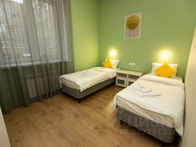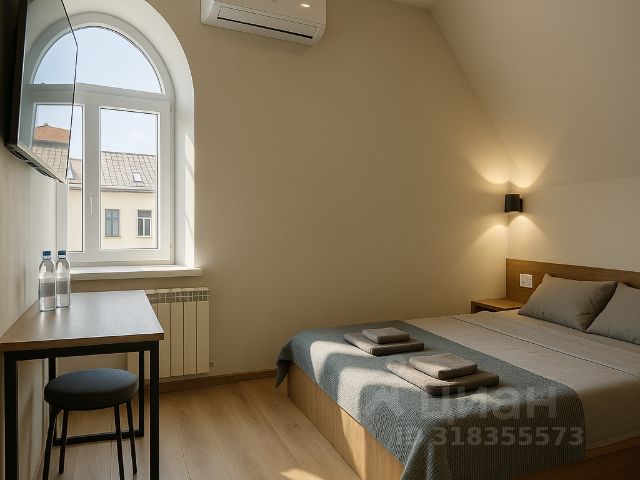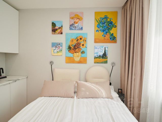 На 13 квадратных метрах тонко сочетаются насыщенные синие и солнечно-жёлтые оттенки, как в самых известных полотнах художника. Из окна открывается вид на Казанский собор, а внутри — ещё более впечатляющий пейзаж: ручная роспись с ветвями миндаля и автопортрет Ван Гога, словно наблюдающего за вами из другого мира. Эти элементы не просто украшают стены — они оживляют атмосферу и создают эффект погружения в творческую вселенную мастера. Картины написаны вручную ярославской художницей, что придаёт пространству особую душу и подлинность. Интерьер продуман до мелочей: двуспальная кровать с мягким бельём, уютный свет, тёплый текстиль и авторский декор, пространство для отдыха.