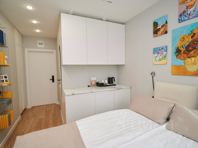На 13 квадратных метрах тонко сочетаются насыщенные синие и солнечно-жёлтые оттенки, как в самых известных полотнах художника. Из окна открывается вид на Казанский собор, а внутри — ещё более впечатляющий пейзаж: ручная роспись с ветвями миндаля и автопортрет Ван Гога, словно наблюдающего за вами из другого мира. Эти элементы не просто украшают стены — они оживляют атмосферу и создают эффект погружения в творческую вселенную мастера. Картины написаны вручную ярославской художницей, что придаёт пространству особую душу и подлинность. Интерьер продуман до мелочей: двуспальная кровать с мягким бельём, уютный свет, тёплый текстиль и авторский декор, пространство для отдыха.