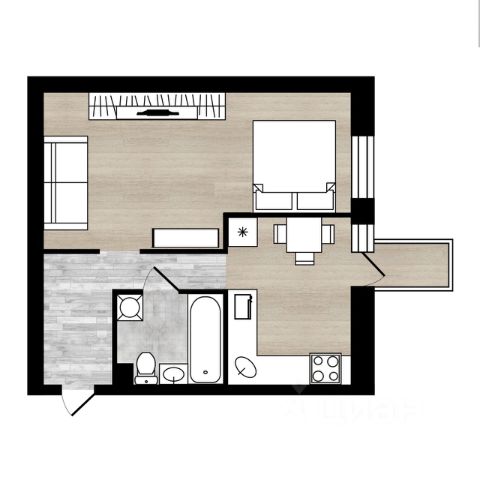 В квартире выполнен косметический ремонт, установлены кухонный гарнитур, шкафы для хранения вещей, организованы спальные места и обеденная зона.