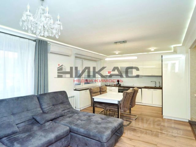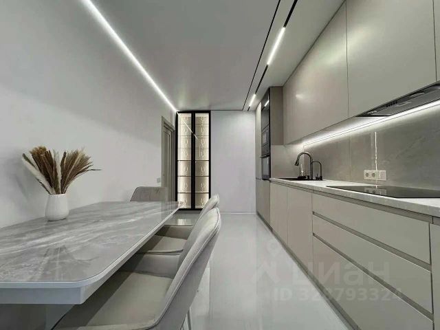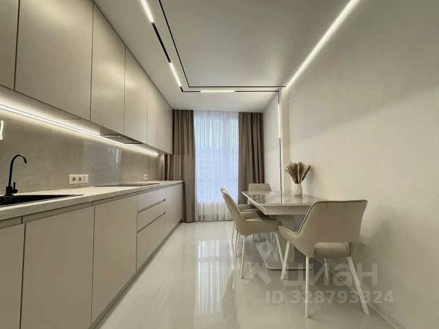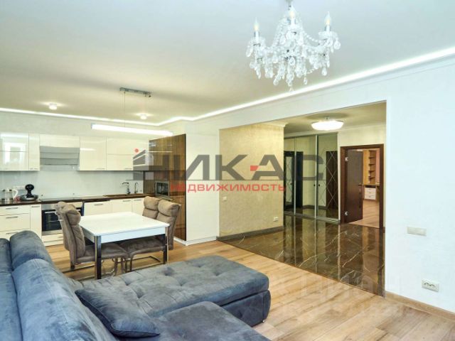 Кухня-гостиная - "сердце" квартиры, множество вариантов подсветки с пультом управления (и верхняя и по периметру комнаты), подсветка зонирована, качественный кухонный гарнитур Италия (глянцевая поверхность столешницы, каменная мойка Италия, ручки в стразах Сваровски, стеклянный фартук), посудомоечная машина, индукционная варочная панель, духовой шкаф, микроволновая печь, фильтр для воды с ионизацией и минерализацией, максимальный уровень очистки, встроенный холодильник, стол, текстильные стулья, угловой модульный диван, новый, раскладывающийся, телевизор, кондиционер (сплит-система с ионизацией, максимальное очищение воздуха, производство Япония, мягкое увлажнение- дышиться "как в лесу"), кофемашина, соковыжималка. Люстра из хрусталя. На полу износоустойчивый ламинат.